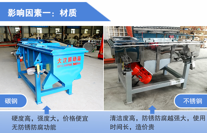 直線篩材質(zhì)分為碳鋼和不銹鋼兩種,碳鋼材質(zhì)(如:Q235)它的硬度高,強(qiáng)度大,價格便宜,是多行業(yè)常用的材質(zhì),但是它沒有防銹防腐功能,所以對于衛(wèi)生環(huán)境要求較高的就推薦您使用不銹鋼材質(zhì)(如:304)它的材質(zhì)清潔度高,防銹防腐越強(qiáng)大,不會污染物料,使用時間長,造價也相對高,所以在夠買的時候您也要根據(jù)成本預(yù)算來進(jìn)行選擇。