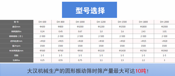 大漢機(jī)械生產(chǎn)的圓形振動(dòng)篩時(shí)篩產(chǎn)量可達(dá)10噸!型號(hào)有:DH-400mm、DH-600mm、DH-800mm、DH-1000mm、DH-1200mm、DH-1500mm、DH-1800mm、DH-2000mm等八種標(biāo)準(zhǔn)型號(hào)??蓾M足肥料每小時(shí)500KG—10T的大、中、小產(chǎn)量的篩分工作。