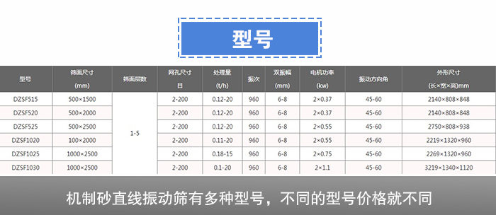 機制砂直線振動篩的型號有:DZSF-515、DZSF-520、DZSF-1020、DZSF-1025、DZSF-1030、DZSF-1035、DZSF-1540等型號,型號越大價格就會越貴,每個型號的直線振動篩都能安裝1-5層的篩網,單層可以進行簡單的篩分、過濾工作,多層可以滿足除雜、分級等不同規(guī)格物料的篩分。不同型號滿足不同用戶對于機制砂篩分的需求。