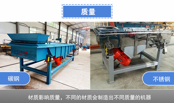 大漢機械生產的機制砂直線振動篩在選材是上精選的優(yōu)質碳鋼和不銹鋼兩種材質,不銹鋼材質相比碳鋼材質多了防銹防腐耐用耐高溫的功能,使用壽命相比碳鋼材質的會更長一點,所以在價格上不銹鋼機制砂直線振動篩會比碳鋼機制砂直線振動篩貴一點,不過對于篩分機制砂來說,普通碳鋼就能滿足篩分需求。